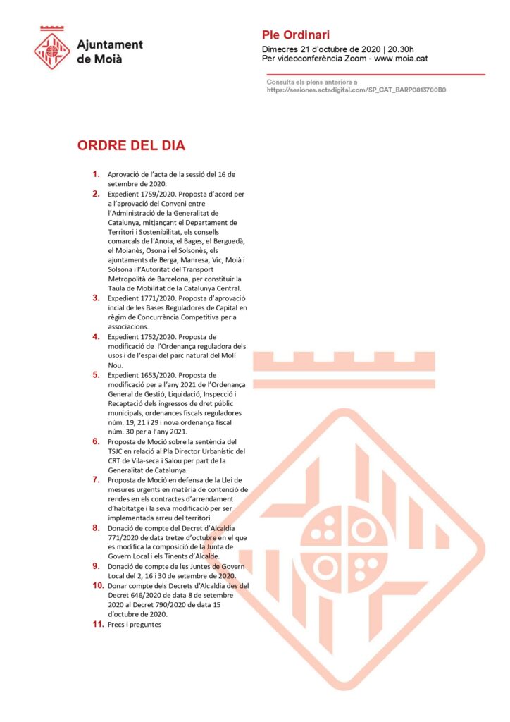L’Ajuntament de Moià convoca un Ple en sessió ordinària dimecres 21 d’octubre a les 20.30h, per videoconferència.