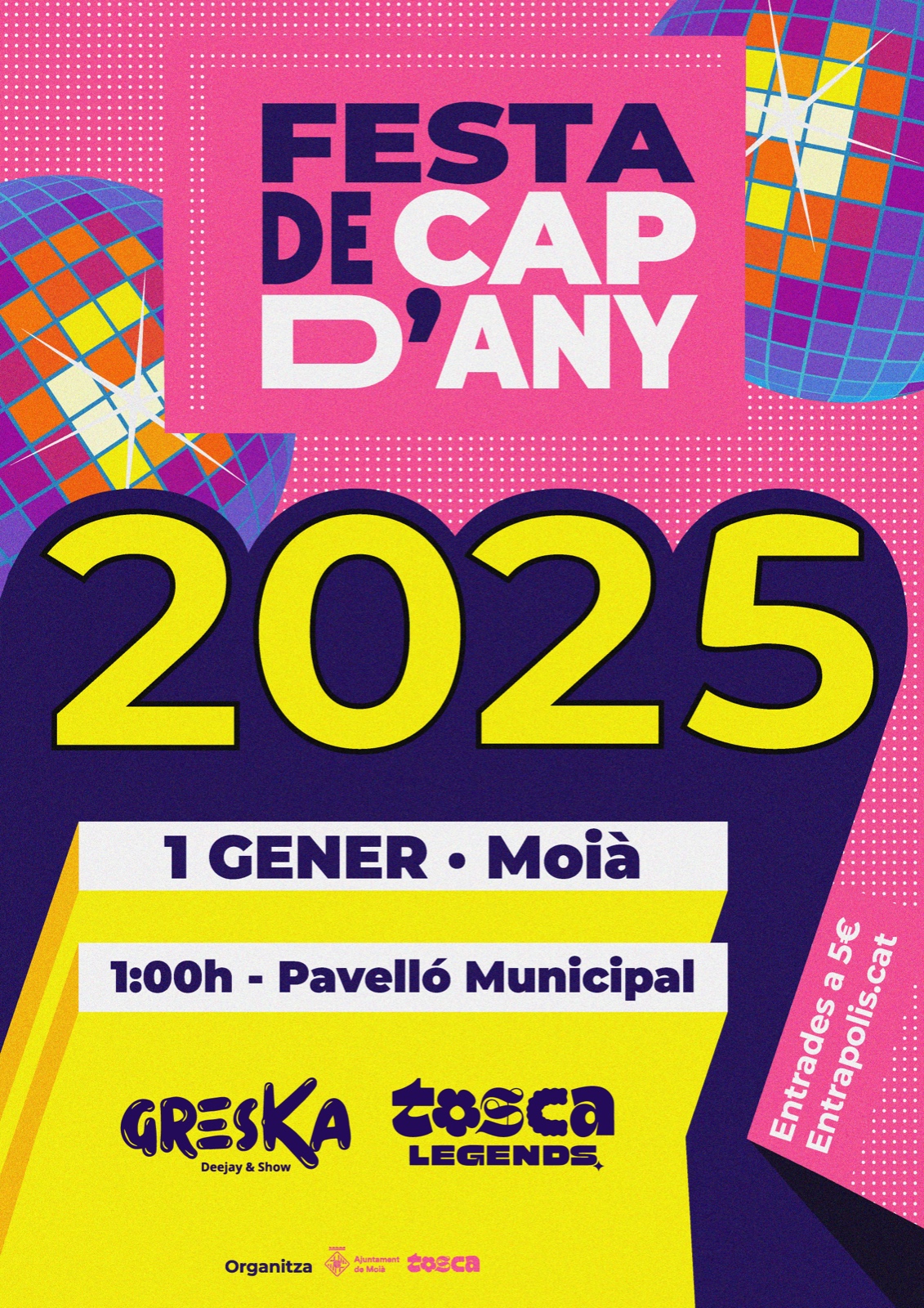 L’1 de gener a partir de la 01h de la matinada vine al Pavelló Municipal amb els teus amics i amigues a donar la benvinguda el 2025. Conjuntament amb Tosca Moià hem organitzat una nit plena de música, festa i sorpreses.