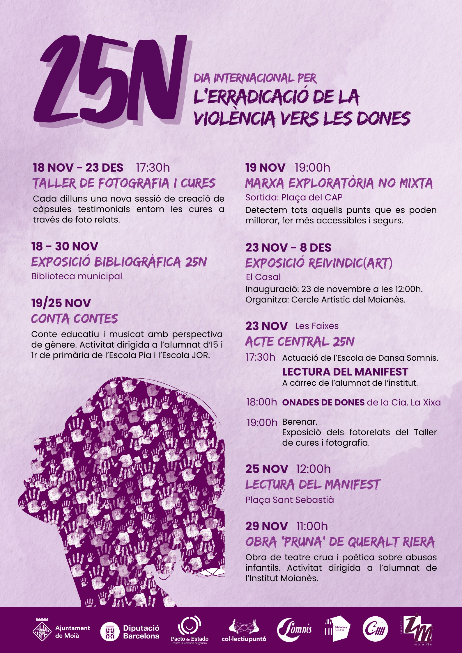 Enguany, el dia 25 de novembre és un dilluns, és per això, que s’ha organitzat l’acte central el dissabte 23 amb 4 propostes. A les 17:30h començarem l’acte amb una actuació de ball a càrrec de l’Escola de Dansa Somnis i se seguirà amb la Lectura del Manifest amb alumnat de l’institut. Seguidament, la companyia de teatre La Xixa, ens presentarà ‘Onades de Dones’ i per acabar, una mica de berenar mentre gaudim de l’exposició dels fotorelats del Taller de cures i fotografia.
