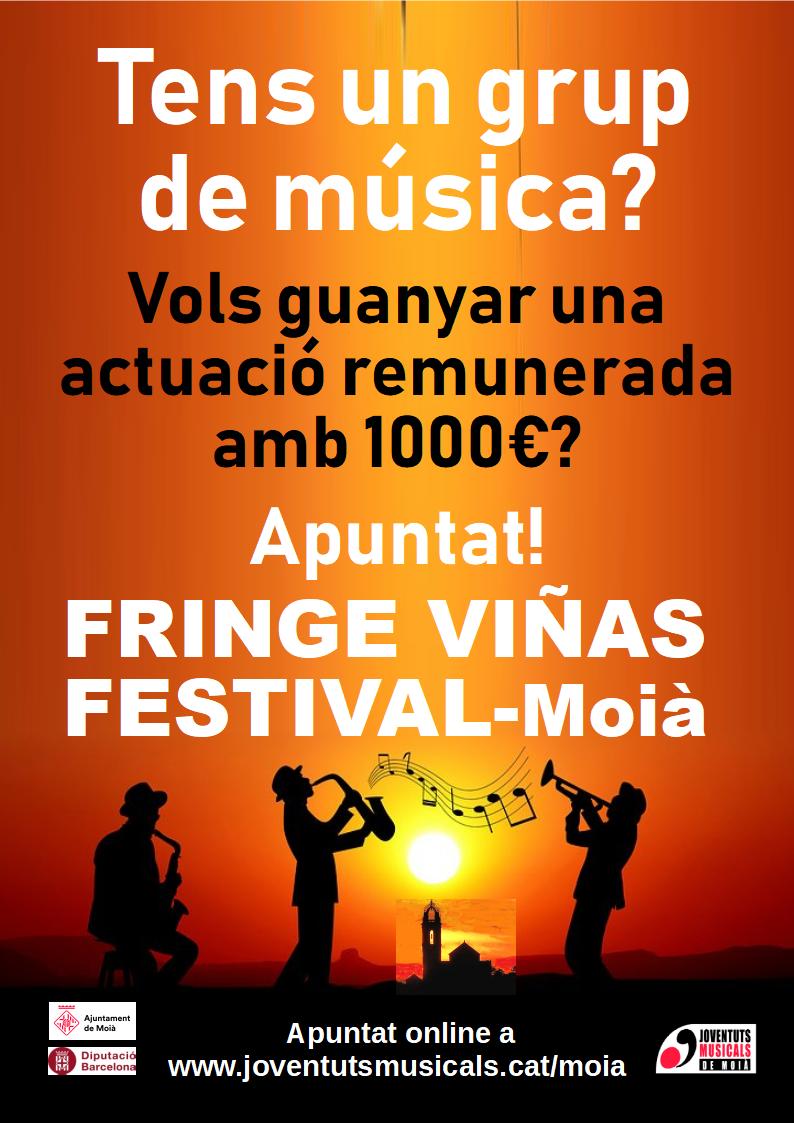Apunta’t al Fringe Festival Viñas-Moià! Tens un grup de música? Vols guanyar una actuació remunerada amb 1000 euros? Més informació a http://www.joventutsmusicals.cat/moia