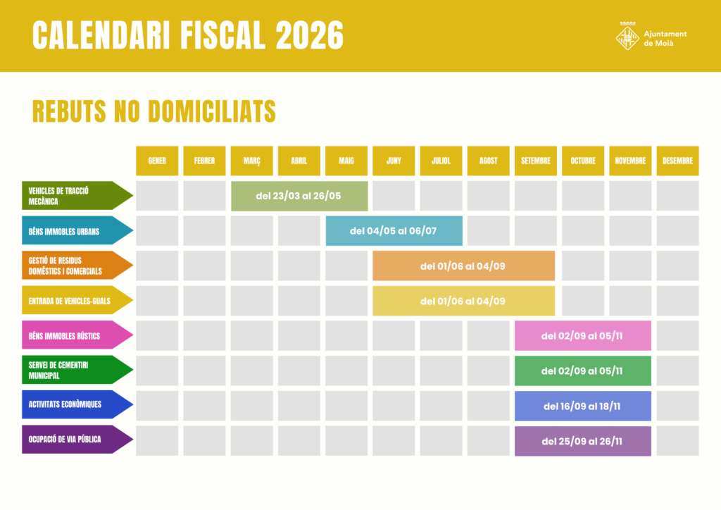 L’Ajuntament de Moià publica el Calendari Fiscal del 2026. Aquest any no pateix gairebé cap modificació respecte l’any anterior, només petites variacions de dies, per efectes de dies hàbils.
