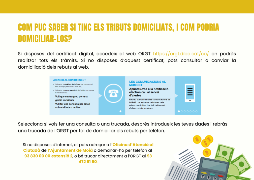 - REBUTS DOMICILIATS: els cobraments són periòdics i es fan en les dates que s’indica en el primer calendari. Cada tribut té terminis i fraccions diferents.