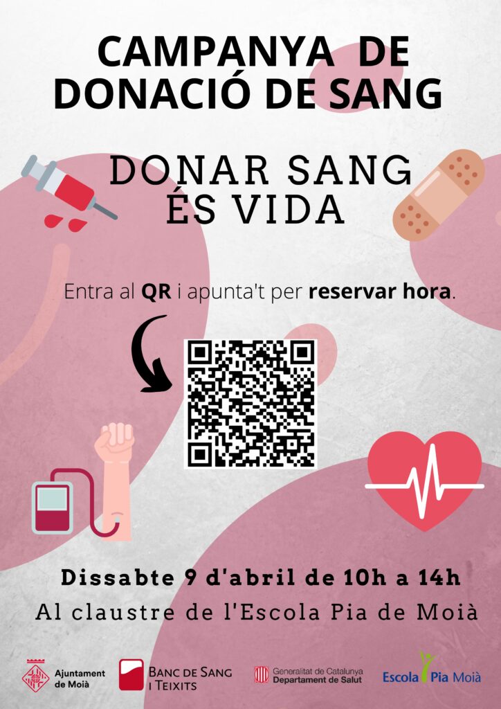 La donació de sang es farà a l’Escola Pia de Moià el dissabte 9 d’abril de 10 a 14h. Compta amb l’eslògan “Donar sang és vida”.