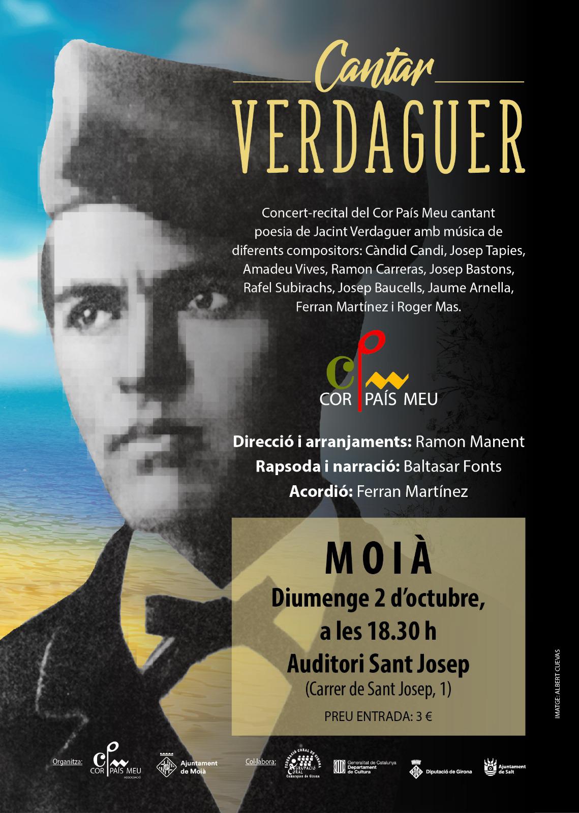 L’Ajuntament de Moià ofereix un Concert-recital a càrrec del Cor País Meu cantant poesia de Jacint Verdaguer amb la narració i el rapsoda Baltasar Fonts, diumenge 2 d’octubre a les 18.30h a l’Auditori de Sant Josep (preu d’entrada 3 euros).
