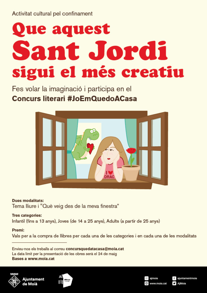 L’Ajuntament de Moià, amb l’objectiu de mantenir l’activitat i la promoció de la cultura en les actuals circumstàncies d’alarma sanitària i de confinament en què estem vivint degut a la pandèmia del Covid-19 i la propera data de Sant Jordi, i a fi també de promoure la creació literària, convoca aquest concurs literari per tal que tothom, des de casa seva, pugui aprofitar el temps lliure per fer volar la imaginació i alhora fent que no s’aturi l’activitat cultural i la participació dels veïns en aquest tipus d’activitats.