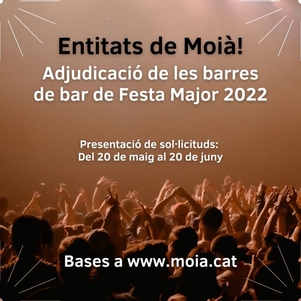 L’Ajuntament de Moià convoca un concurs per a l’adjudicació de les dues barres de bar de Festa Major 2022 que se situaran a l’esplanada de la part de baix del Parc Municipal del 12 al 16 d’agost, de 23.00 a 04.30h.