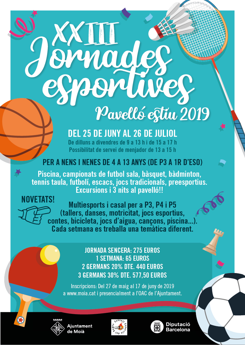 Viu l’estiu a les XXIII Jornades esportives al pavelló del 25 de juny al 25 de juliol per a alumnes de P3 a 1r d’ESO. NOVETAT: Multiesports i casal temàtic setmanal per a nens i nenes de P3, P4 i P5 amb tallers, danses, motricitat, jocs esportius, contes, bicicleta, jocs d’aigua, cançons, piscina…