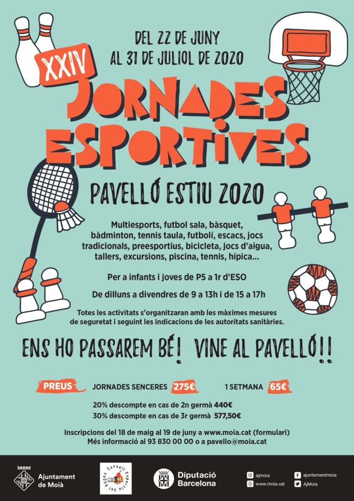 Viu l’estiu a les XXIV Jornades esportives al pavelló del 22 de juny al 31 de juliol per a infants i joves de P5 a 1r d’ESO. Organitzat per l’Ajuntament i el Consell Esportiu del Bages.