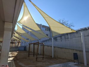 Aprofitant la porxada existent, s’hi han instal·lat un conjunt de veles o tendals tensats en forma de triangle, subjectats amb pilars ancorats a sabates de formigó armat, que permeten ampliar de manera significativa la superfície d’ombra sense necessitat d’una gran intervenció i contribueixen a millorar el confort de l’espai durant els mesos més calorosos. El fet que es tracti d’elements desmuntables aporta, a més, una major flexibilitat d’usos, facilitant la celebració d’activitats festives i altres esdeveniments a l’exterior.