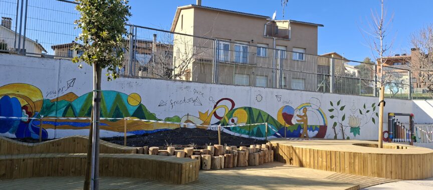 Aquesta intervenció manté el mural elaborat recentment per l’alumnat i transforma l’espai en una zona més amable, verda i polivalent, que fomenta noves dinàmiques de joc i convivència.