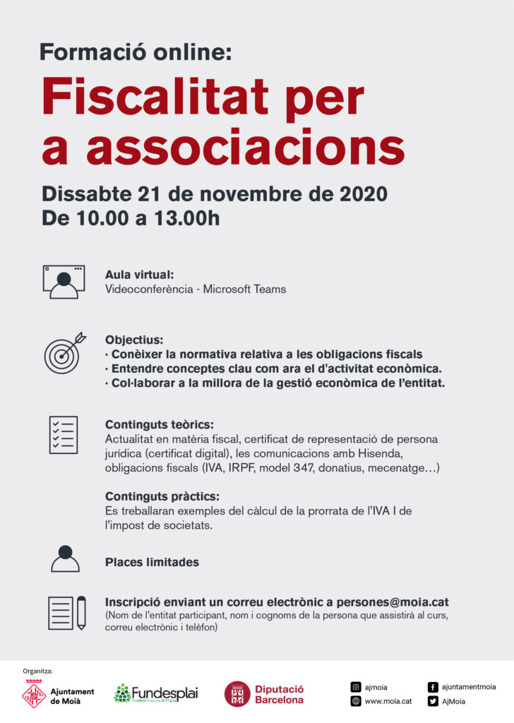 Dissabte 21 de novembre de 10 a 13h a través de videoconferència. L’Ajuntament de Moià amb el suport de Diputació de Barcelona ofereix una formació online per a les entitats de Moià: Fiscalitat per a associacions, que impartirà Fundesplai. Places limitades.