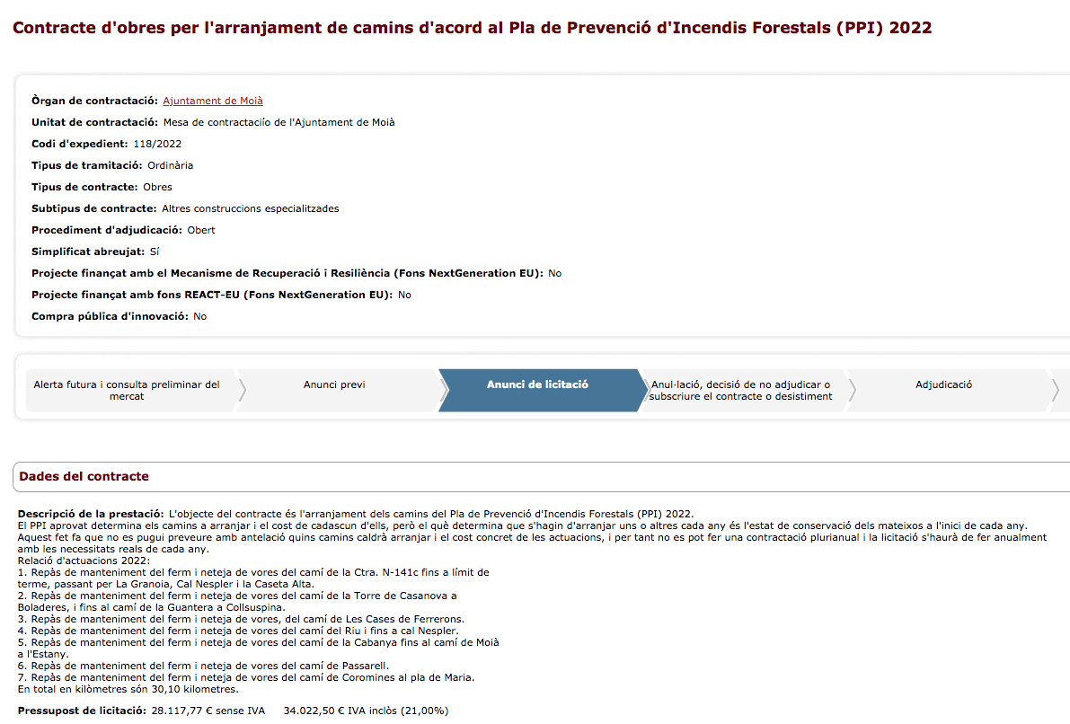 Licitació oberta: L’objecte del contracte és l’arranjament dels camins del Pla de Prevenció d’Incendis Forestals (PPI) 2022.