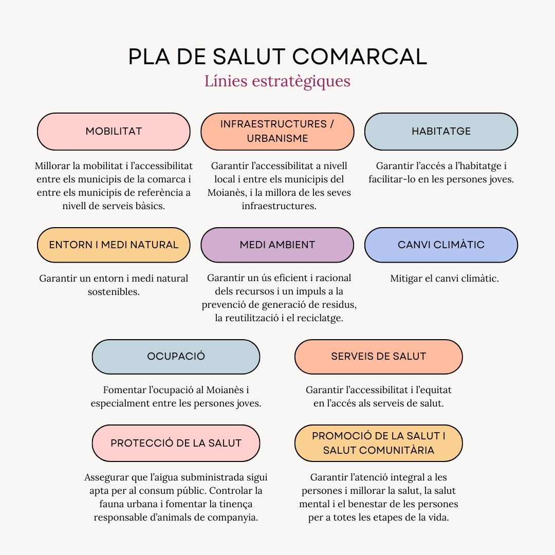Per altra banda, el Pla de Salut Comarcal del Moianès és un instrument que analitza, ordena, prioritza i proposa accions per a la millora de la salut de les persones tant a escala municipal com comarcal. És un pla pioner, ja que és el primer pla de salut de caràcter comarcal elaborat a Catalunya.