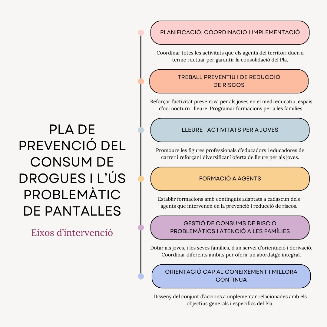Per assolir aquests objectius, el document defineix 6 eixos estratègics i 19 objectius específics per seguir durant el període 2022-25. Algunes de les primeres accions a implementar-se han consistit en la creació de la comissió tècnica de seguiment i en la capacitació dels seus membres amb 4 sessions de formació sobre drogues i pantalles. Cal destacar que el pla té una metodologia circular perquè són els principals agents socials qui defineixen el problema, en planegen les solucions i posteriorment, les executen.