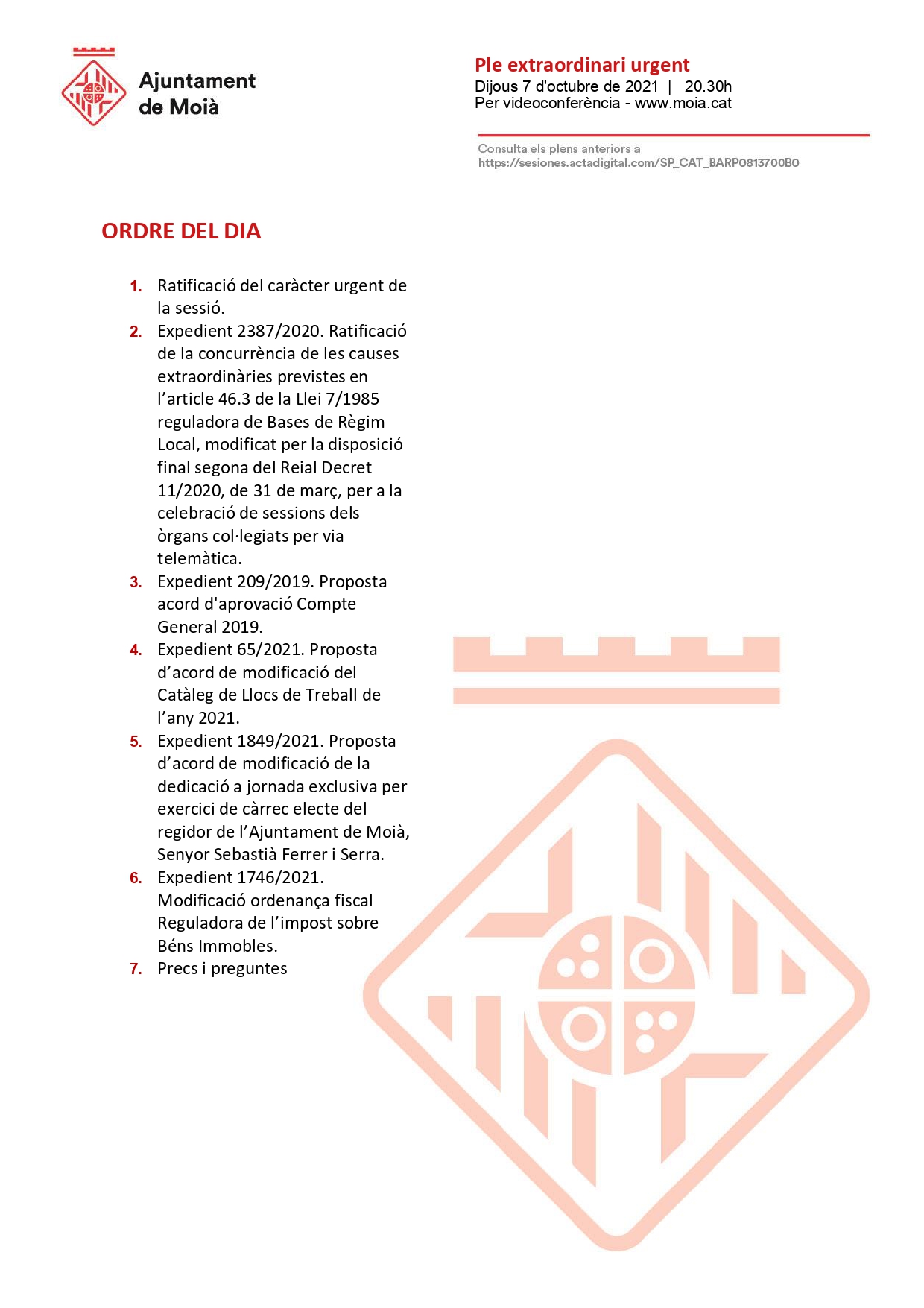 L’Ajuntament de Moià convoca un Ple en sessió extraordinària urgent el dijous 7 d’octubre a les 20.30h, per videoconferència amb aquest ordre del dia.