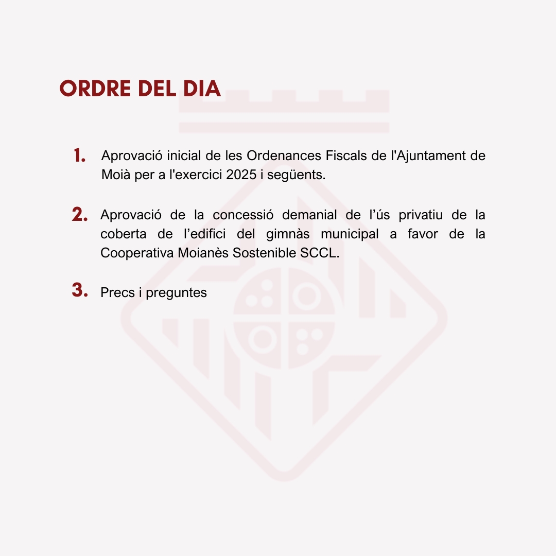 L’Ajuntament de Moià convoca un Ple en sessió extraordinària amb motiu de l’aprovació inicial de les Ordenances Fiscals de l’Ajuntament de Moià per a l’exercici 2025 i següents, i de l’aprovació de la concessió demanial de l’ús privatiu de la coberta de l’edifici del gimnàs municipal a favor de la Cooperativa Moianès Sostenible SCCL.