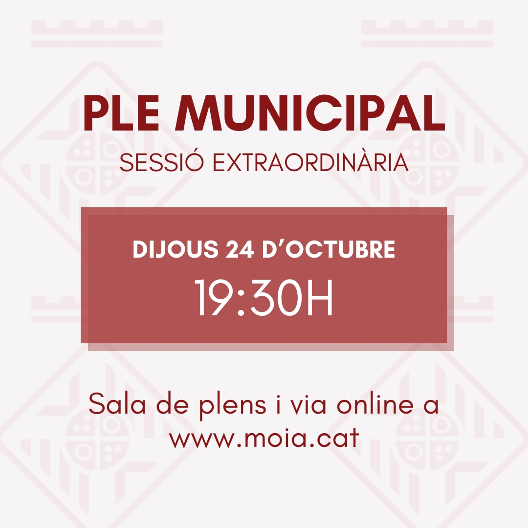 L’Ajuntament de Moià convoca un Ple en sessió extraordinària amb motiu de l’aprovació inicial de les Ordenances Fiscals de l’Ajuntament de Moià per a l’exercici 2025 i següents, i de l’aprovació de la concessió demanial de l’ús privatiu de la coberta de l’edifici del gimnàs municipal a favor de la Cooperativa Moianès Sostenible SCCL.