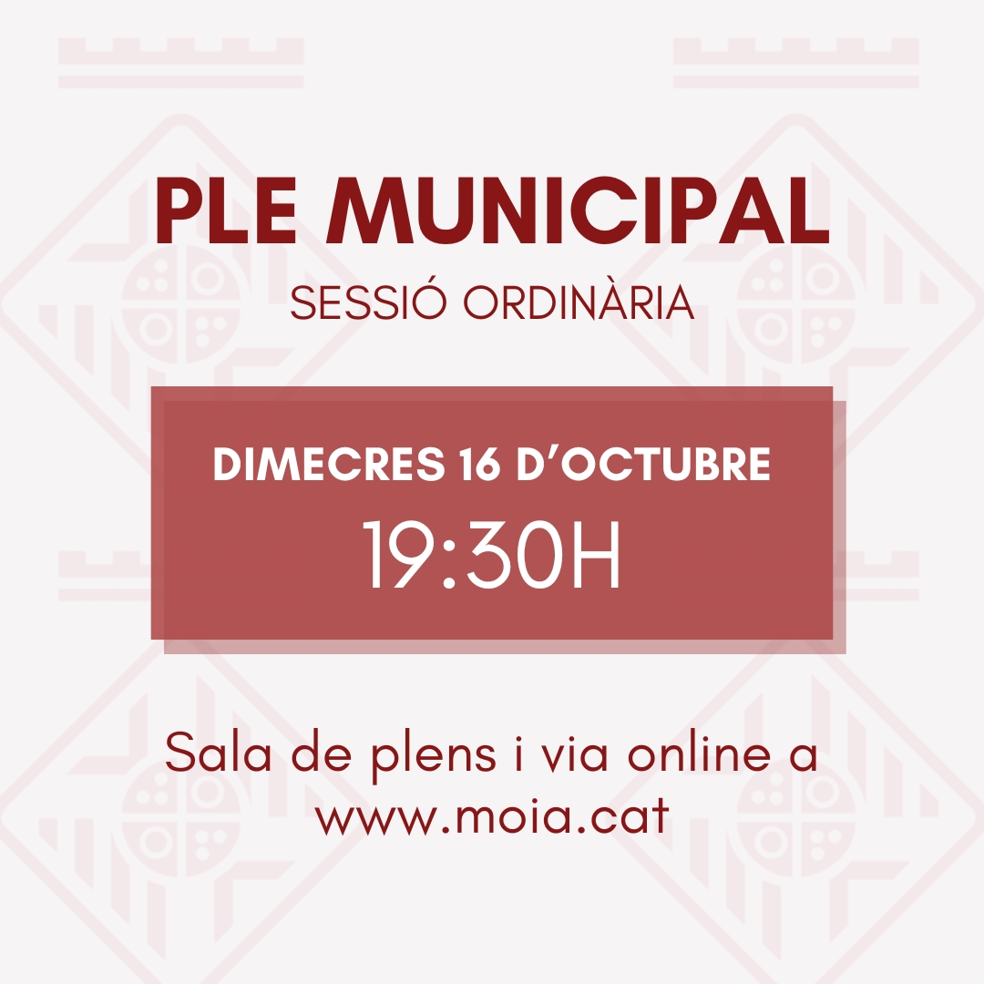 L’Ajuntament de Moià convoca el pròxim Ple municipal en sessió ordinària el dimecres 16 d’octubre a les 19:30 hores a la sala de Plens. Es pot seguir també via online aquí.