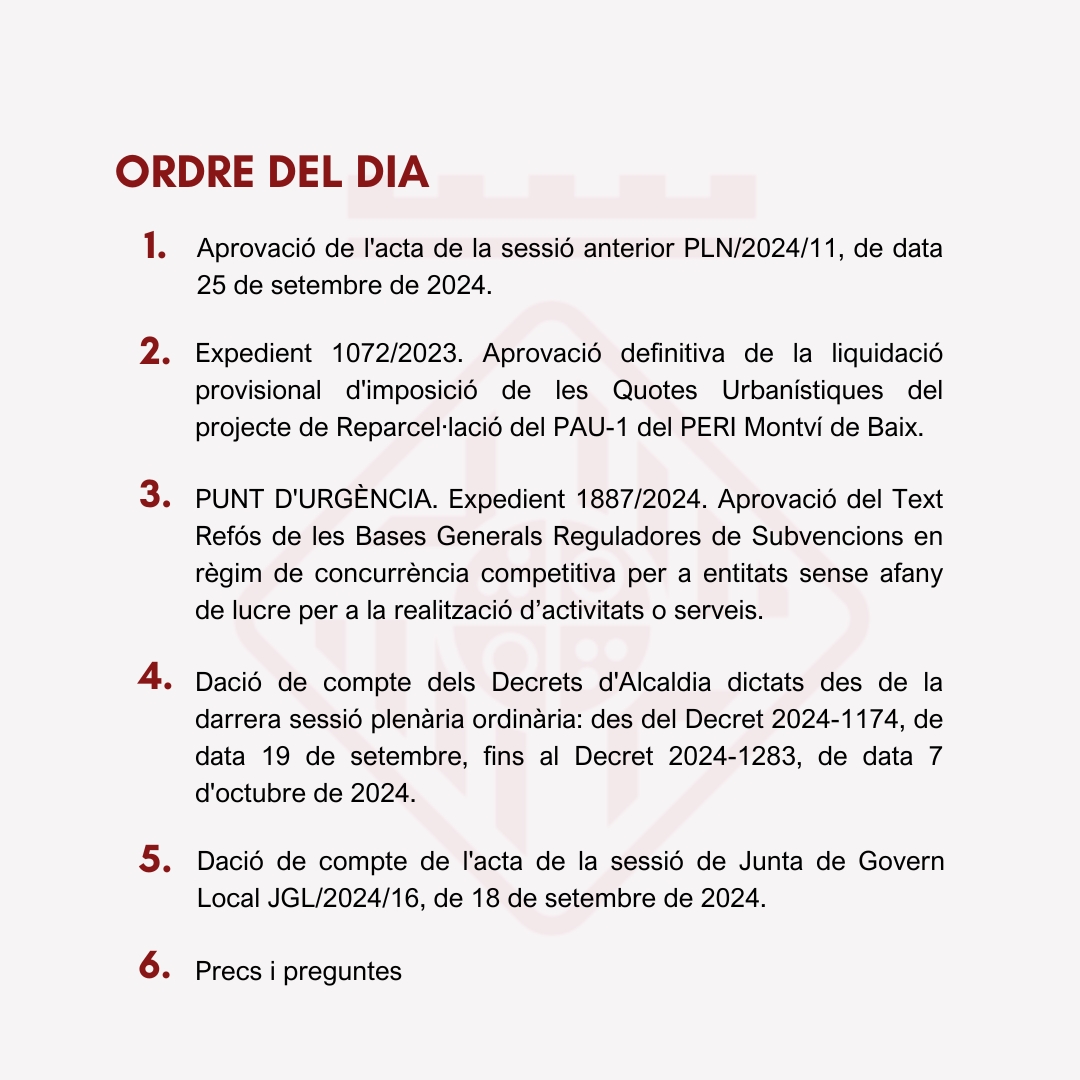 PLE MUNICIPAL: sessió ordinària de dimecres 16 d’octubre de 2024 a les 19:30h