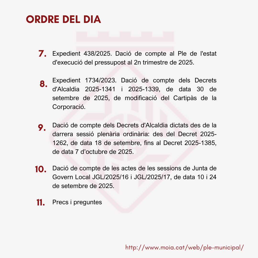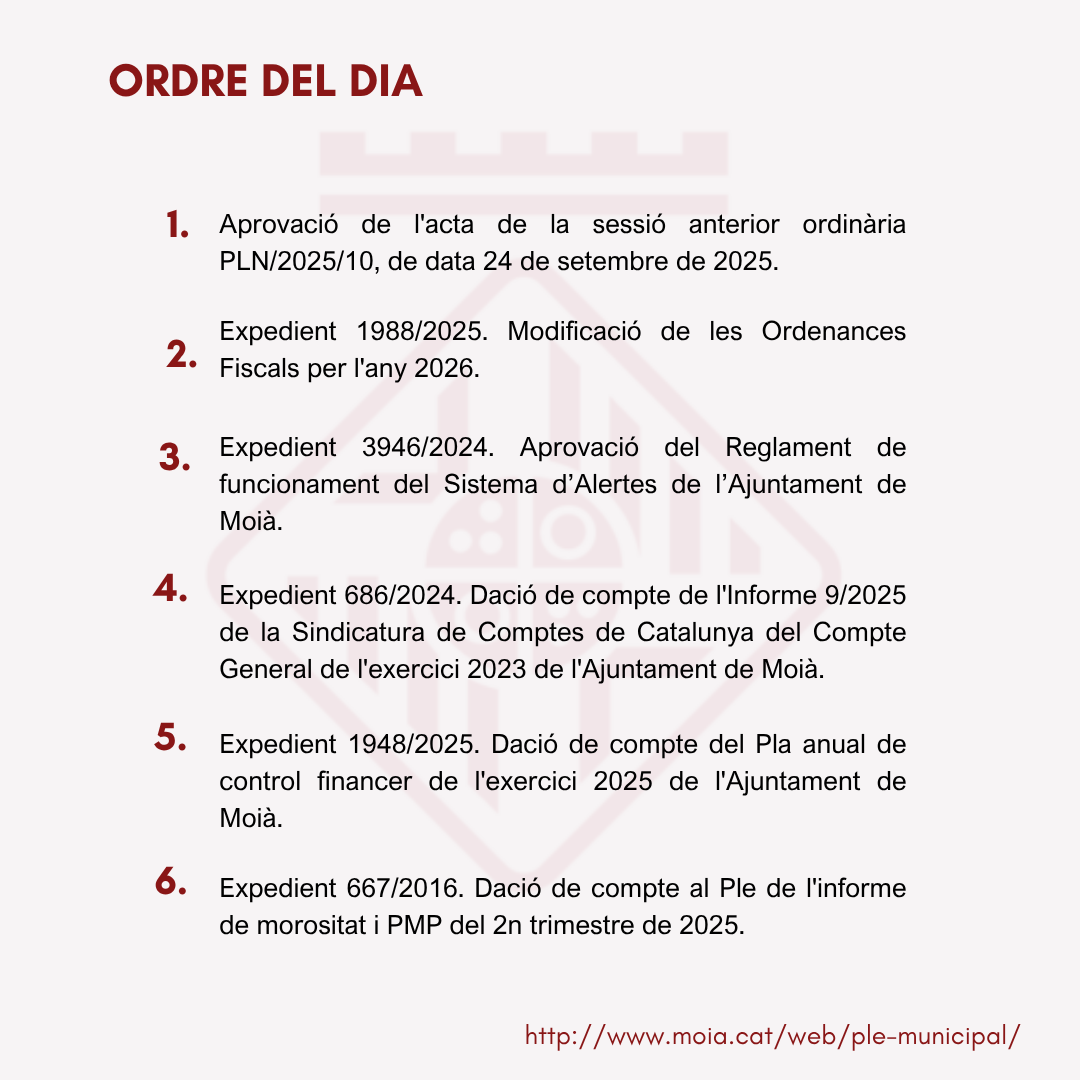 L’Ajuntament de Moià convoca el pròxim Ple municipal en sessió ordinària el dimecres 22 d’octubre de 2025 a les 19:30 hores a la sala de Plens. Es pot seguir també via online aquí.