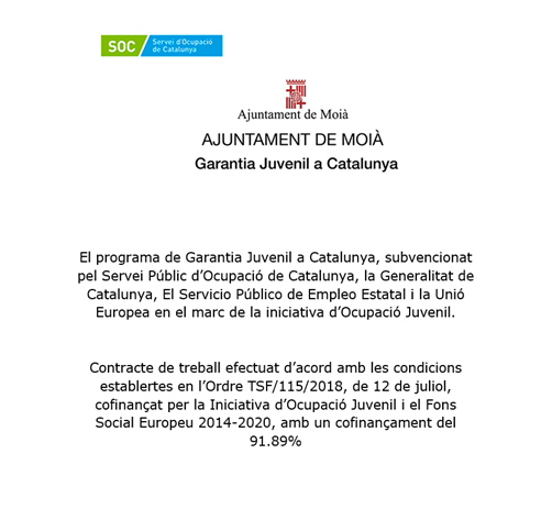 Contracte de treball efectuat d’acord amb les condicions establertes en l’Ordre TSF/115/2018, de 12 de juliol, cofinançat per la Iniciativa d’Ocupació Juvenil i el Fons Social Europeu 2014-2020, amb cofinançament del 91,89%.