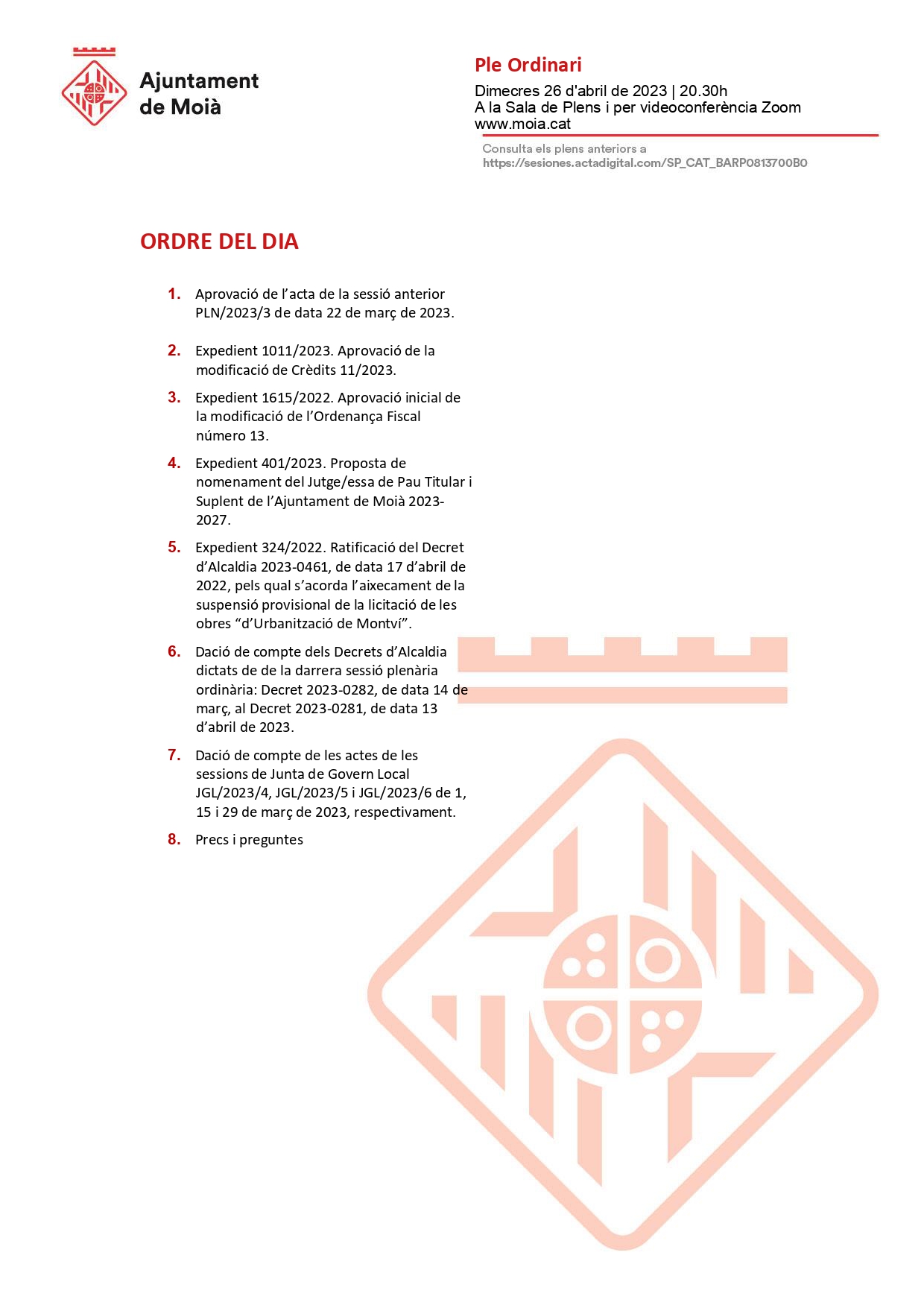 L’Ajuntament de Moià convoca un Ple en sessió ordinària el dimecres 26 d’abril a les 20.30h amb aquest ordre del dia.