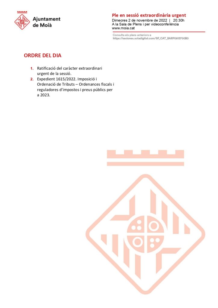 L’Ajuntament de Moià convoca un Ple en sessió extraordinària urgent el dimecres 2 de novembre a les 20.30h amb aquest ordre del dia.