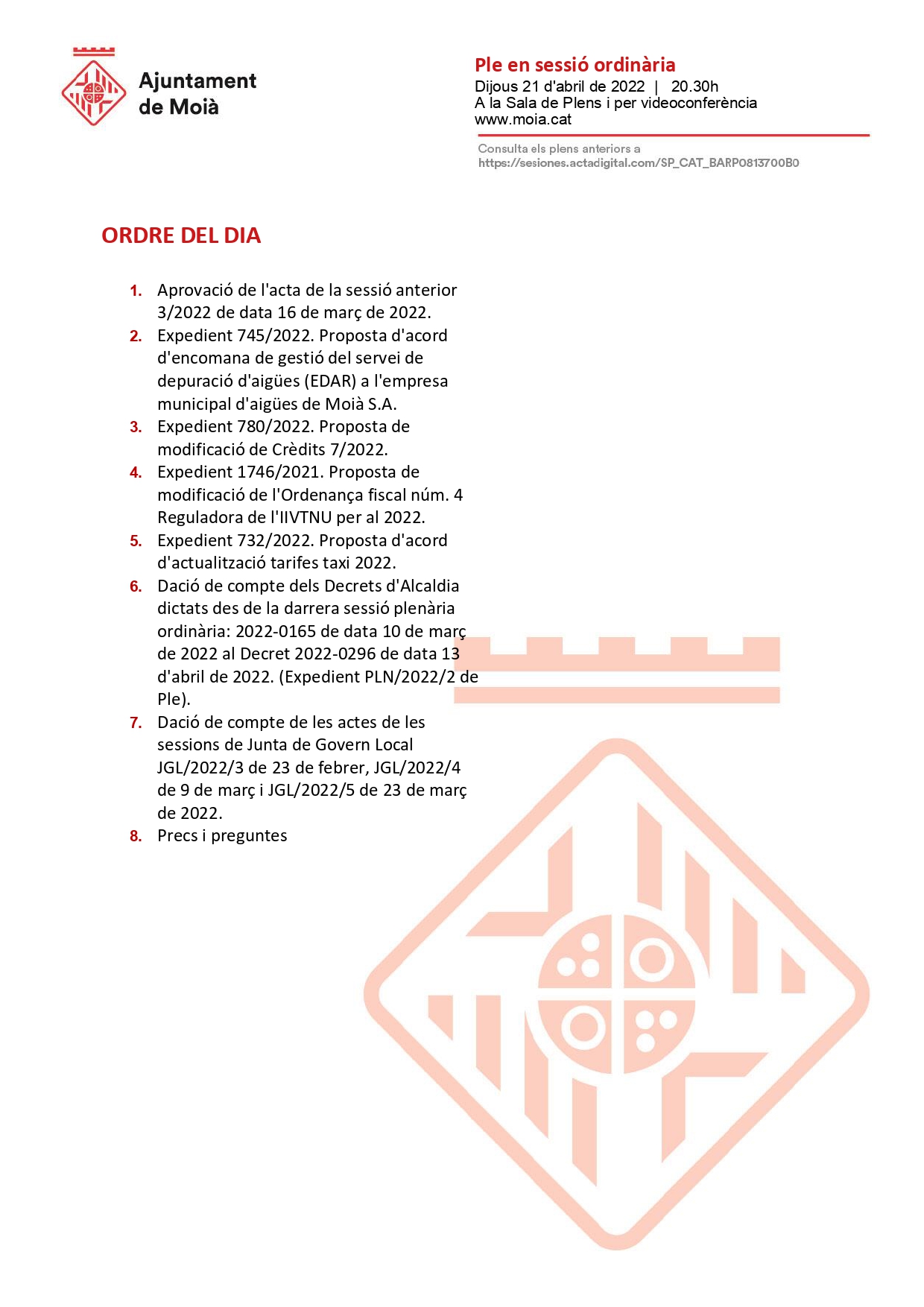 L’Ajuntament de Moià convoca un Ple en sessió ordinària el dijous 21 d’abril a les 20.30h amb aquest ordre del dia.