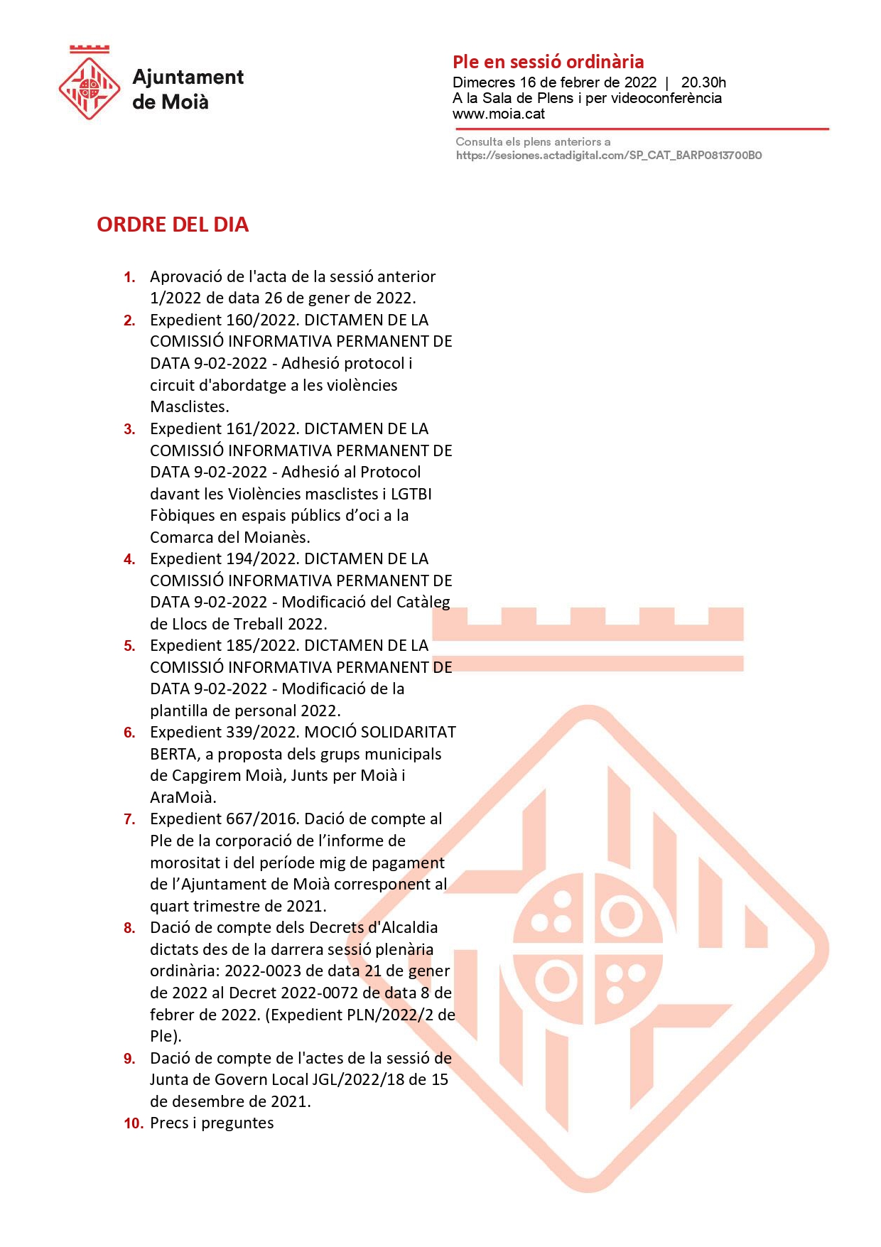 L’Ajuntament de Moià convoca un Ple en sessió ordinària el dimecres 16 de febrer a les 20.30h amb aquest ordre del dia.