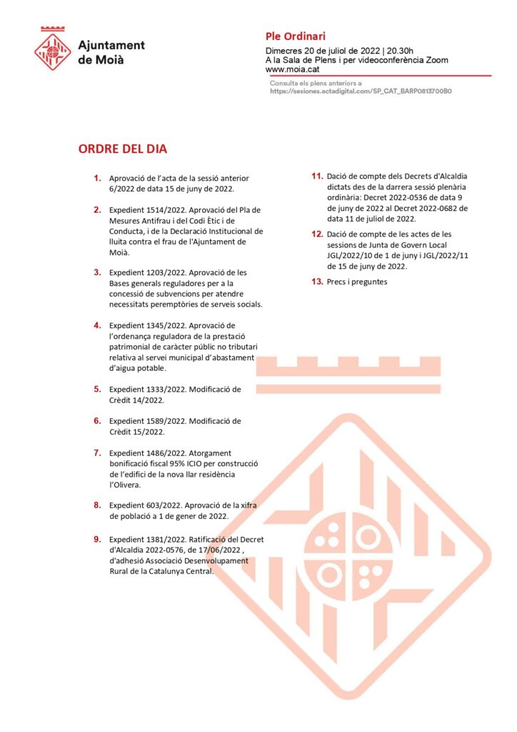 L’Ajuntament de Moià convoca un Ple en sessió ordinària el dimecres 20 de juliol a les 20.30h amb aquest ordre del dia.