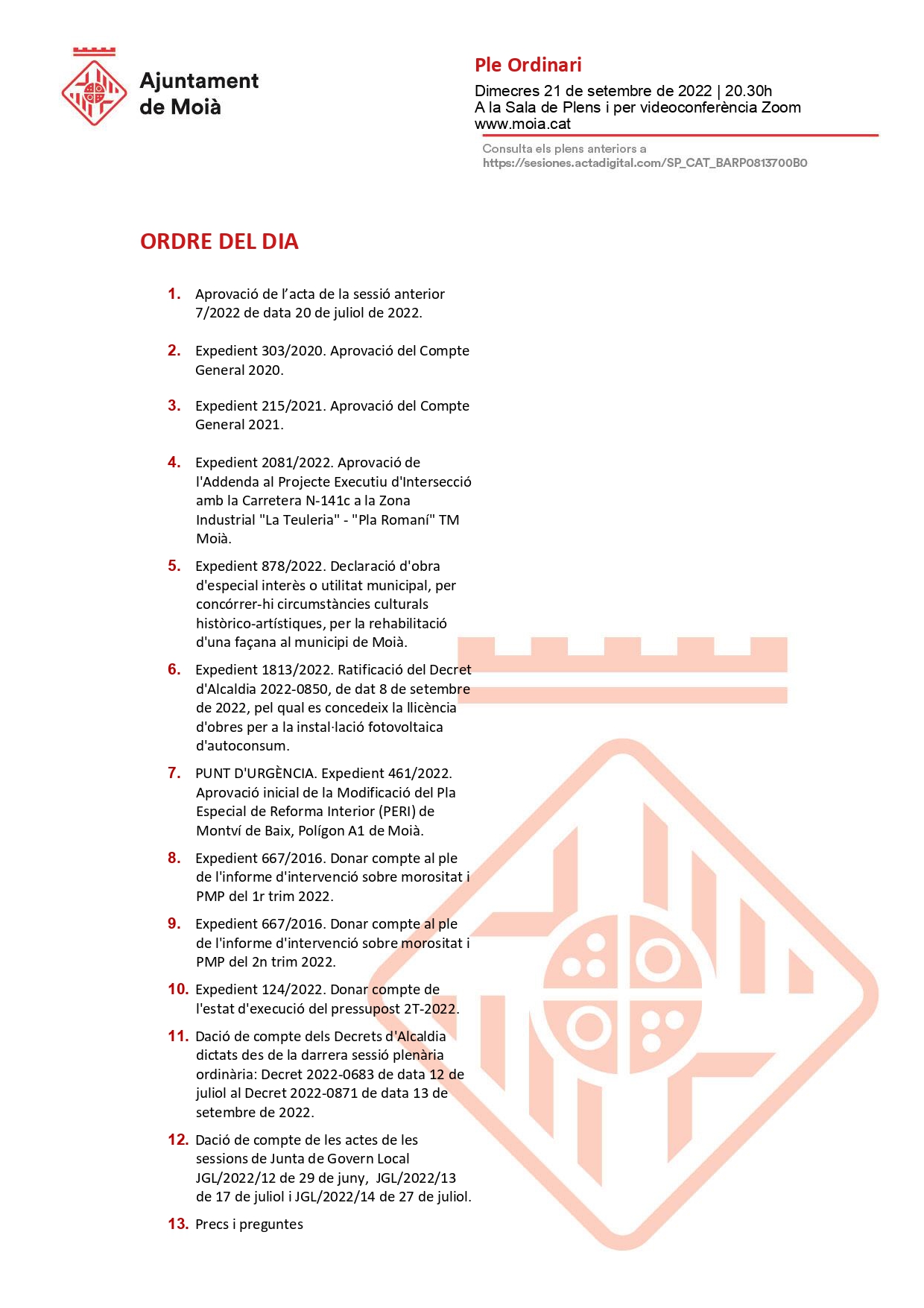 L’Ajuntament de Moià convoca un Ple en sessió ordinària el dimecres 21 de setembre a les 20.30h amb aquest ordre del dia.