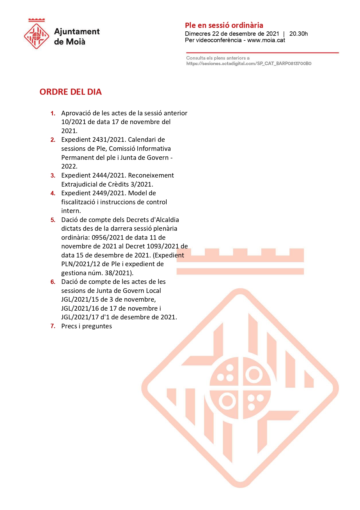 L’Ajuntament de Moià convoca un Ple en sessió ordinària el dimecres 22 de desembre a les 20.30h amb aquest ordre del dia.