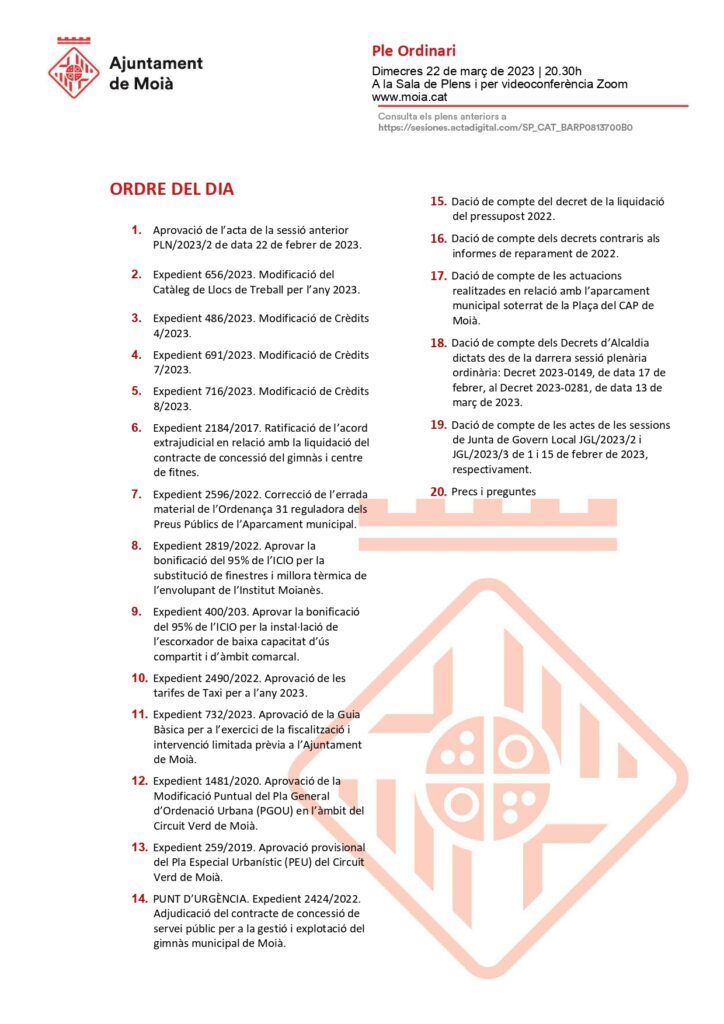 L’Ajuntament de Moià convoca un Ple en sessió ordinària el dimecres 22 de març a les 20.30h amb aquest ordre del dia.