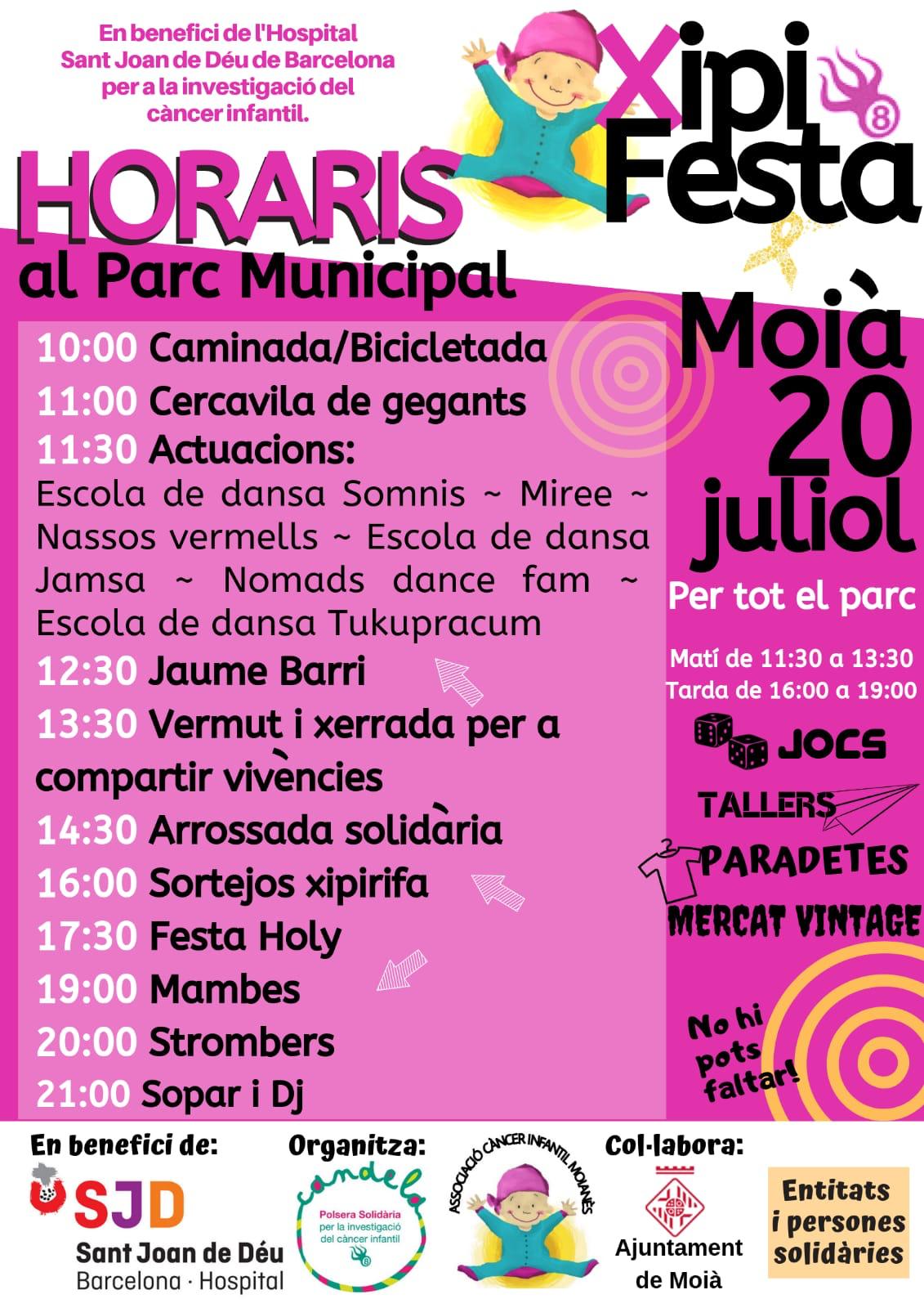 El dissabte 20 de juliol s’organitza la XipiFesta en benefici de l’Hospital Sant Joan de Déu de Barcelona per a la investigació del càncer infantil. Durant tot el dia al parc municipal hi haurà actuacions musicals, dansa, esport, jocs, tallers… organitzat per l’Associació Càncer Infantil del Moianès (ACIM) i Candela Polsera solidària.